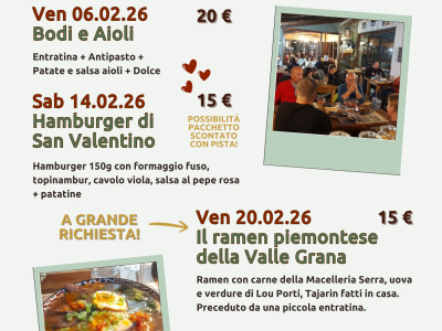 Serate gastronomiche organizzate da EmotionAlp al Centro Polifunzionale Abrì di Pradleves, presso il bar degli impianti sportivi e pista di pattinaggio su ghiaccio dal 6 febbraio all'1 marzo.