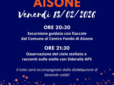 Venerdì 13 febbraio, alle 20.30 ad Aisone escursione guidata con fiaccole dal Comune verso il Bar Centro Fondo di Aisone. A seguire osservazione del cielo stellato con Sideralis APS.