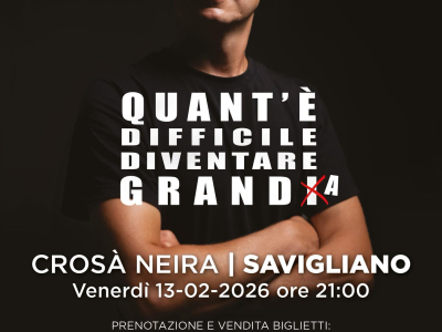 Venerdì 13 febbraio, alle ore 21.00, presso la Sala Crosà Neira di Savigliano, 20 Training Lab organizza lo spettacolo "Quant'è difficile diventare grandi" del noto influencer fossanese L