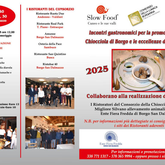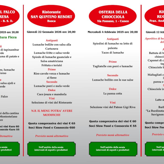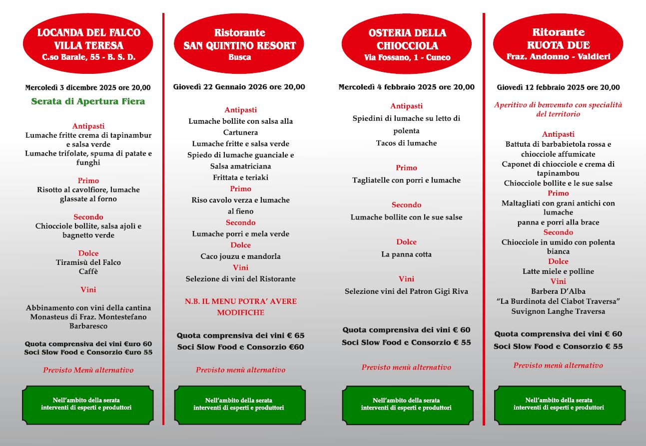 Programma delle serate gastronomiche per la promozione della chiocciola di Borgo San Dalmazzo: giovedì 22 gennaio, mercoledì 4 febbraio e giovedì 12 febbraio 2026.
