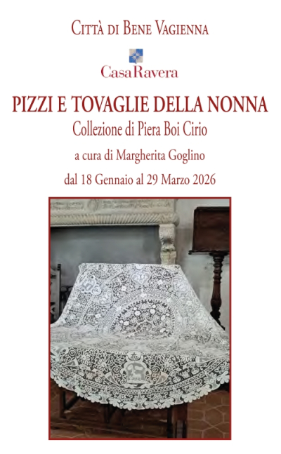 Da domenica 18 gennaio a domenica 29 marzo, Casa Ravera a Bene Vagienna ospita la mostra "Pizzi e tovaglie della nonna", collezione di Piera Boi Cirio, a cura di Margherita Goglino. L’inaugurazione si terrà il 18 gennaio alle ore 11.30. La mostra è aperta nei giorni festivi dalle 10.00 alle 12.00 e dalle 15.00 alle 18.00. Ingresso libero.