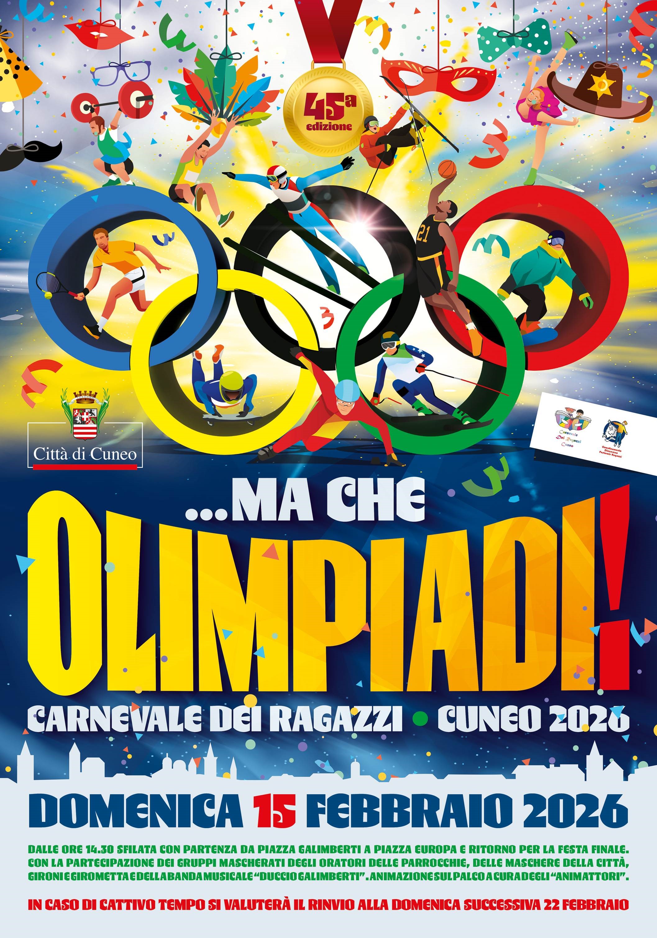 È in programma domenica 15 febbraio la tradizionale sfilata del “Carnevale Ragazzi” per le vie di Cuneo. “...ma che Olimpiadi” è il tema scelto per la manifestazione, giunta quest’anno alla sua 45esima edizione. La sfilata partirà alle 14.30 da piazza Galimberti per raggiungere piazza Europa. Successivamente, il ritorno sulla medesima direttrice per la festa finale che si terrà nella piazza dedicata all’eroe della Resistenza: Duccio Galimberti.