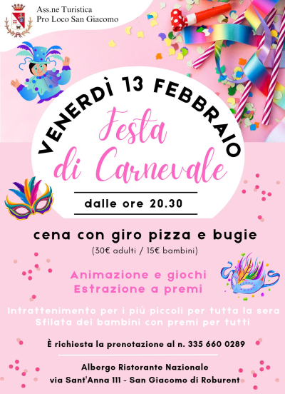 Venerdì 13 Febbraio dalle ore 20:30, presso l'Albergo Ristorante Nazionale, la Pro Loco San Giacomo organizza una "Festa di Carnevale". Ci saranno giro pizza, bugie e poi animazione, giochi e una estrazione a premi. I più piccoli, che giocheranno insieme ad un'animatrice, verranno preparati per la sfilata in costume. La prenotazione è obbligatoria per telefono e la quota di partecipazione è 30 euro per gli adulti e 15 euro per i bambini.