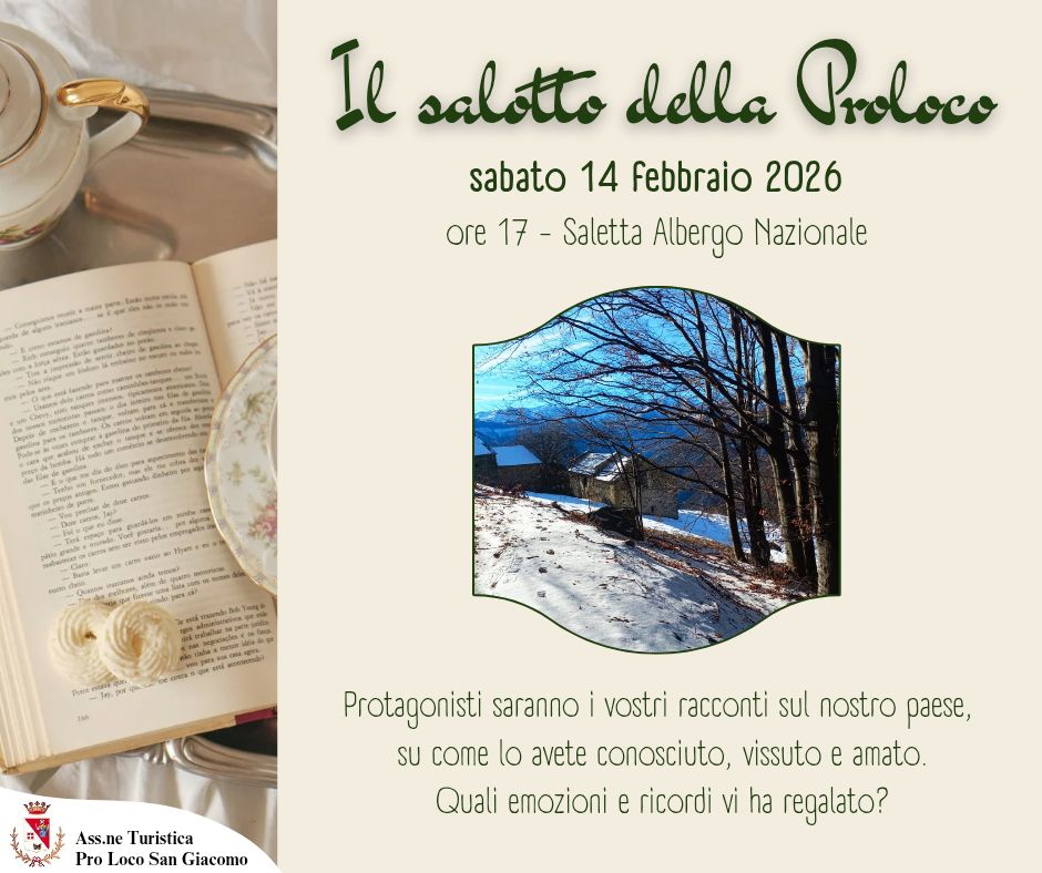 Sabato 14 febbraio alle ore 17:00, presso la saletta dell'Albergo Nazionale, la Pro Loco San Giacomo organizza "Il salotto della Pro Loco". L'ingresso è libero e gratuito.