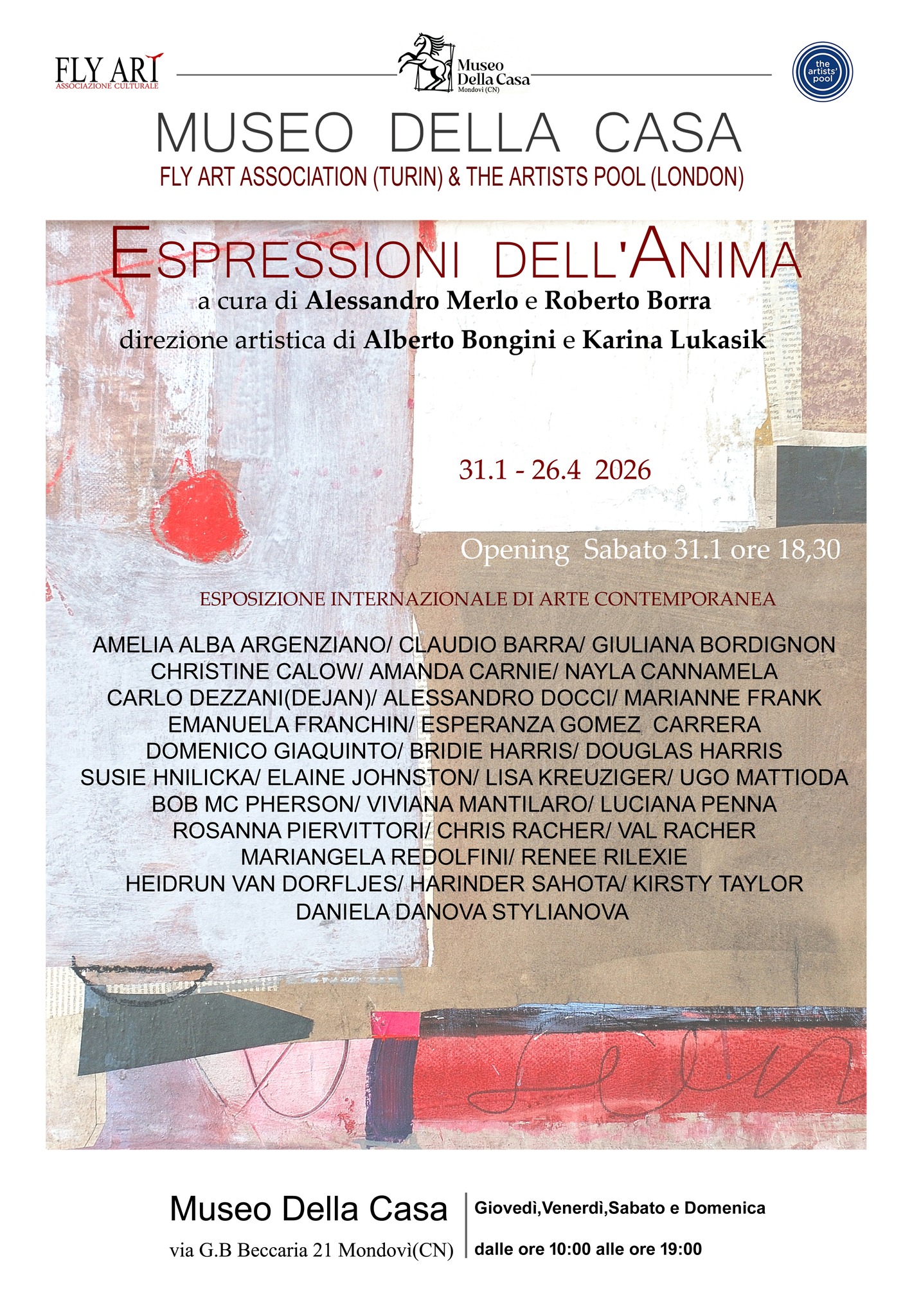 Dal 31 gennaio al 26 aprile il Museo Della Casa ospita la mostra “Espressioni dell’Anima”, un percorso che racconta emozioni, identità e interiorità attraverso l’arte. La mostra, curata da Alessandro Merlo e Roberto Borra propone le opere di circa 30 artisti.