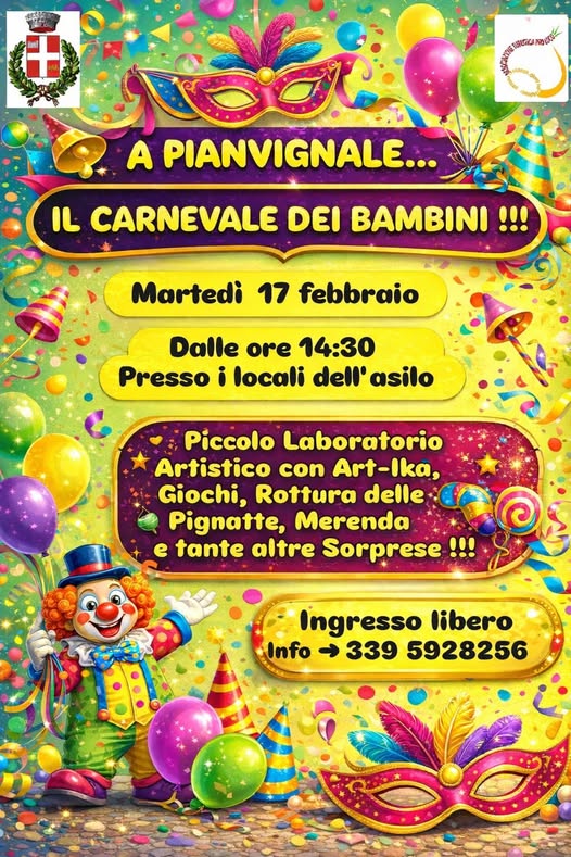 Martedì 17 febbraio dalle ore 14.30, festa di carnevale per i bambini a Frabosa Sottana, frazione Pianvignale. Giochi e divertimento per festeggiare insieme il Martedì Grasso. Ingresso libero.