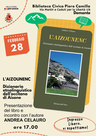 Sabato 28 febbraio, alle ore 17 presso la Biblioteca Civica "Piero Camilla" di Demonte, appuntamento con l'autore Andrea Celauro e presentazione del volume "L’Aizounenc - Dizionario etnolinguistico dell’occitano di Aisone". Ingresso libero e gratuito.